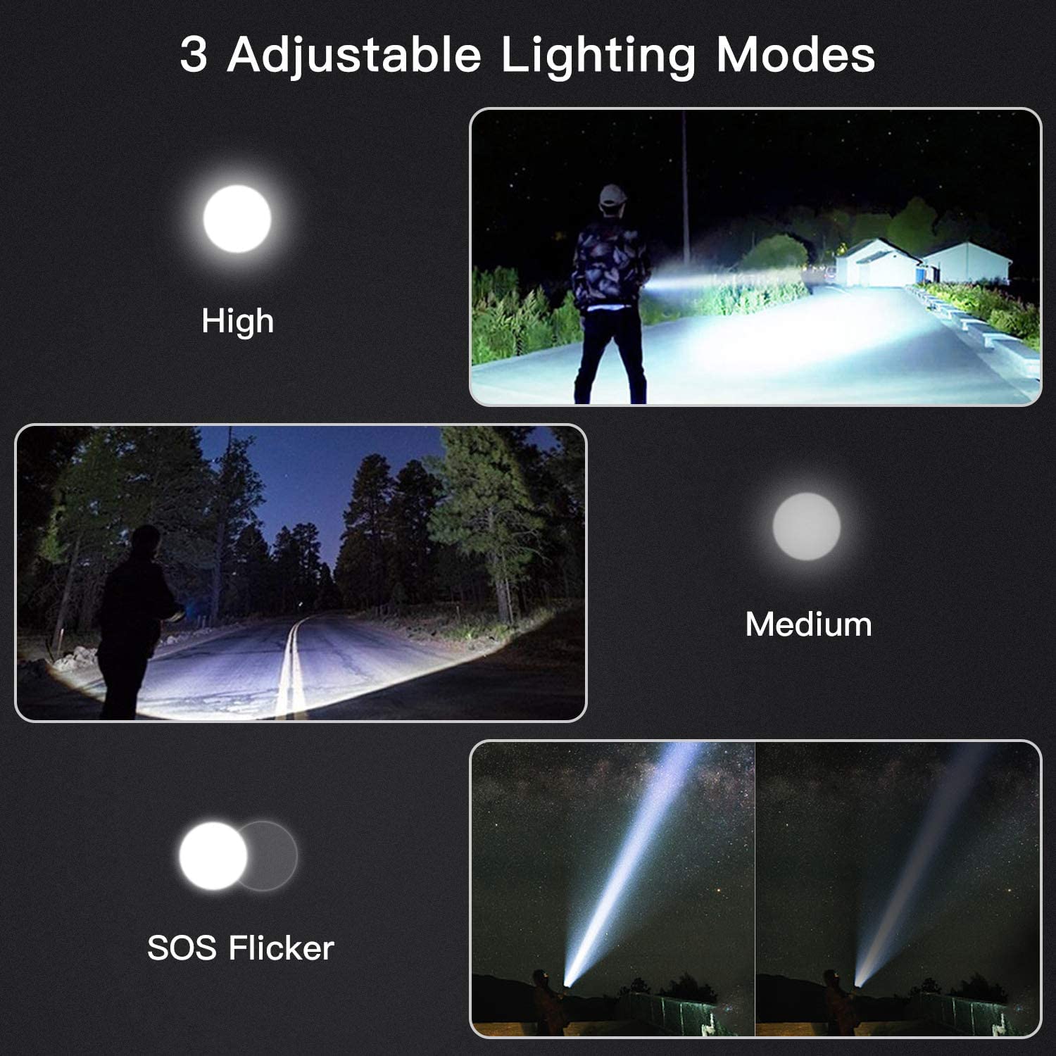 3 Lighting Modes & Telescopic Zoom: Trusted by professionals, our high lumens flashlight comes with 3 light adjustment modes: High, low, strobe. Additionally, its adjustable focus lets you shift between flood light to illuminate the environment and long range spotlight for investigate at a distant focused area.