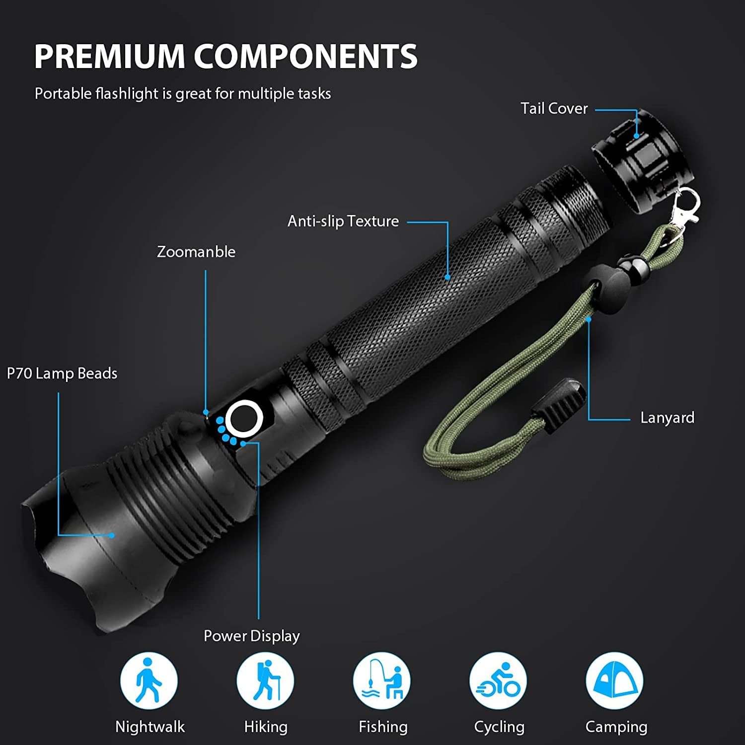 LED Rechargeable XPH70 6000 Lumens Ultra-Bright Zoomable Waterproof Powerful 3-Modes Tactical Flash Torch Light with 2 x 18650 Battery