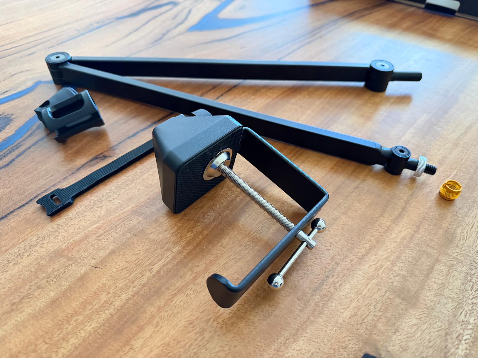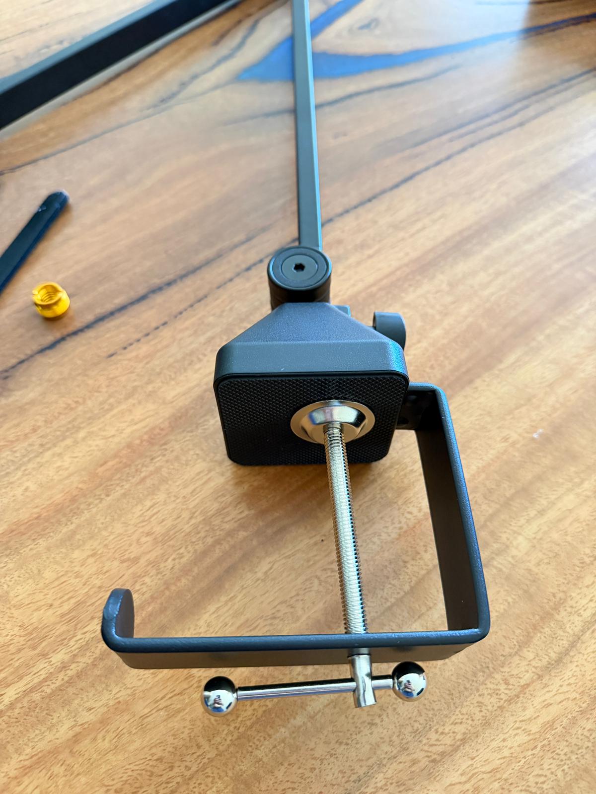 Package List 1 mic scissor arm, 1 table mounting clamp, 4 audio cable tie, 1 Allen key. (NOTE: Please loosen the knob before adjusting the angle of the microphone arm to avoid twisting it too hard and damaging the threads.