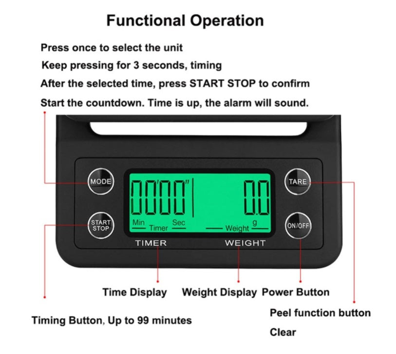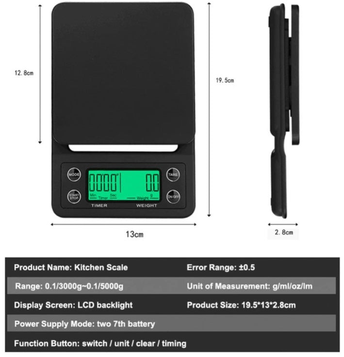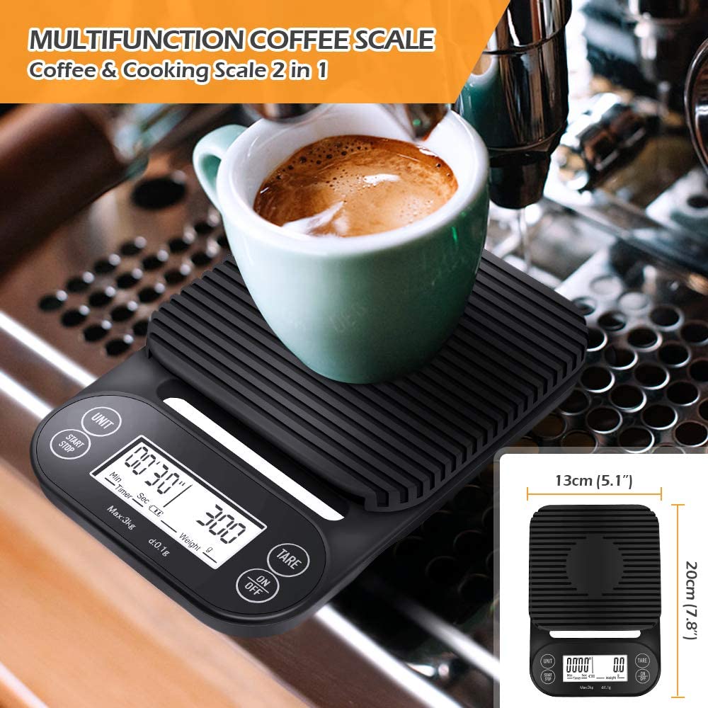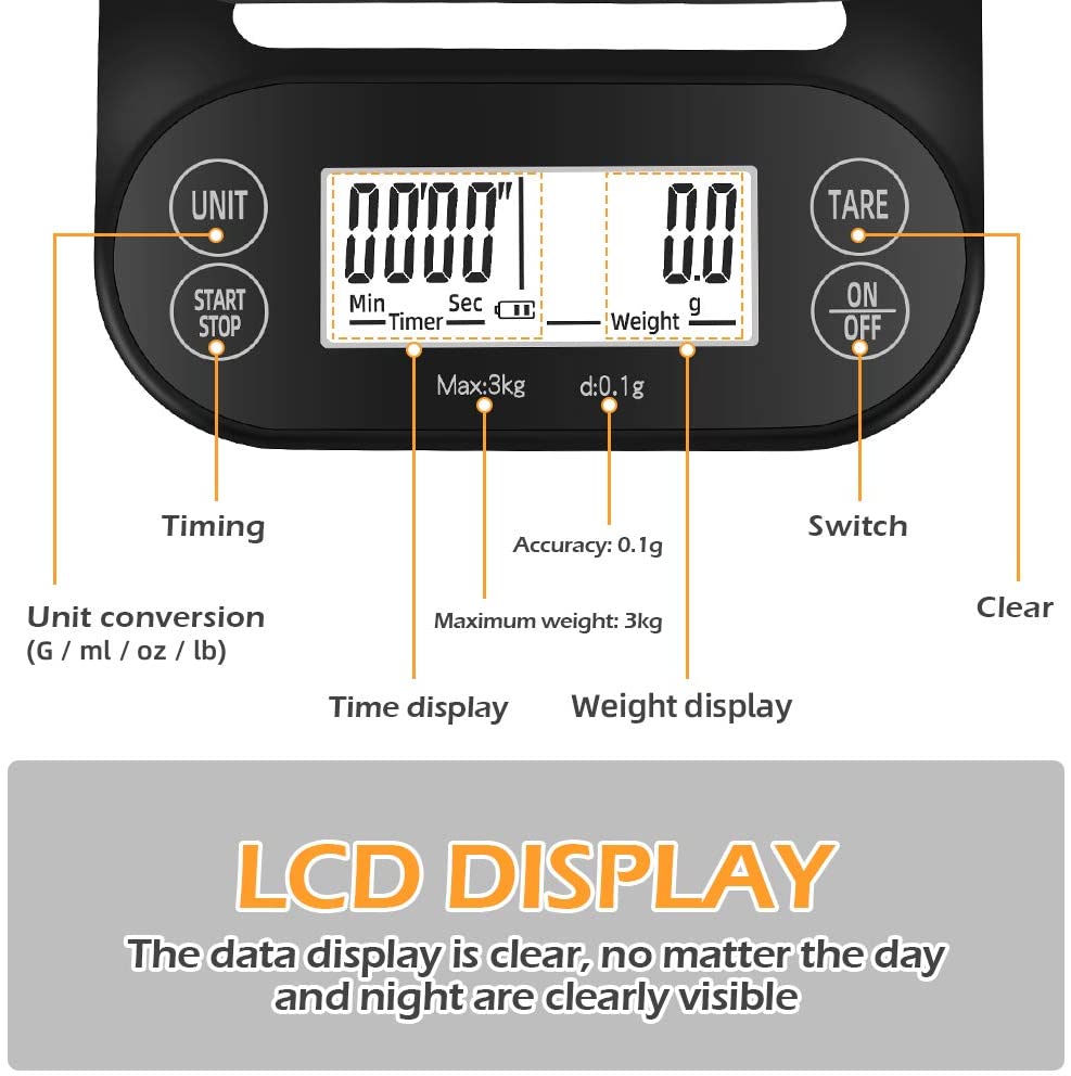TIMING FUNCTIONS - This coffee scale has a timing function, high precision sensors to ensure a accurate measurements from 0.1 oz /1 g to 3000g/ml, 5 different units of measurement in OZ, LB,G,ML,G/ML INTELLIGENT POWER-SAVING MODE - The coffee weighs off the screen automatically in 3 minutes and automatically shuts down in 5 minutes to save power. More power saving, so battery life is longer.