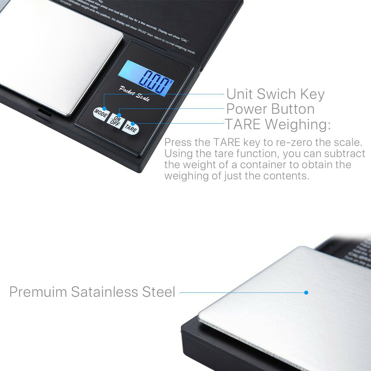 HIGH PRECISION: High precision sensor system ensure accurate weight readings, this digital gram scale have wide blue Back-light LCD display, easy to read. Flip-open lid protects the delicate weighing surface and also for weighing tray. Over-load indicator LIGHT WEIGHT & COMPACT DESIGN: Handy in size and easy to carry & store, convenient to carry it everywhere