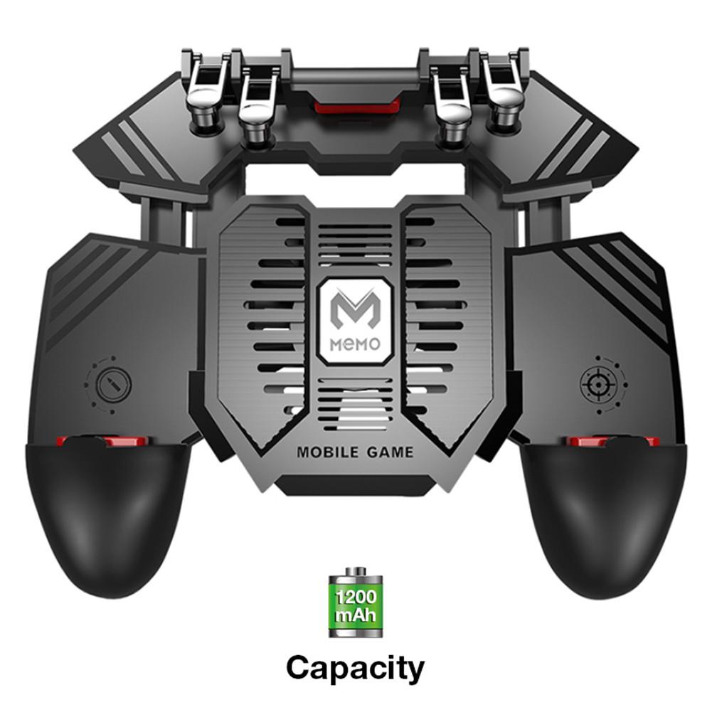 6 fingers MEMO 4000mAh Battery Power Bank Gamepad AK77 L2 R2 Fire Trigger Cooling Fan Gamepad For PUBG Mobile Games The product has 4 triggers, Can be operated with 6 fingers at the same time,which can customize more game buttons to make the game operation more flexible. 1. The built-in 4000mAh rechargeable battery can provide power to the fan to cool your smart phone while playing mobile phone games,The battery has a short-circuit protection chip for stable current and long time using life.