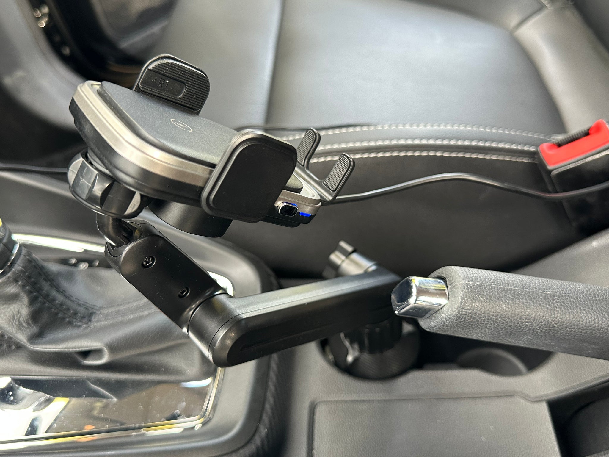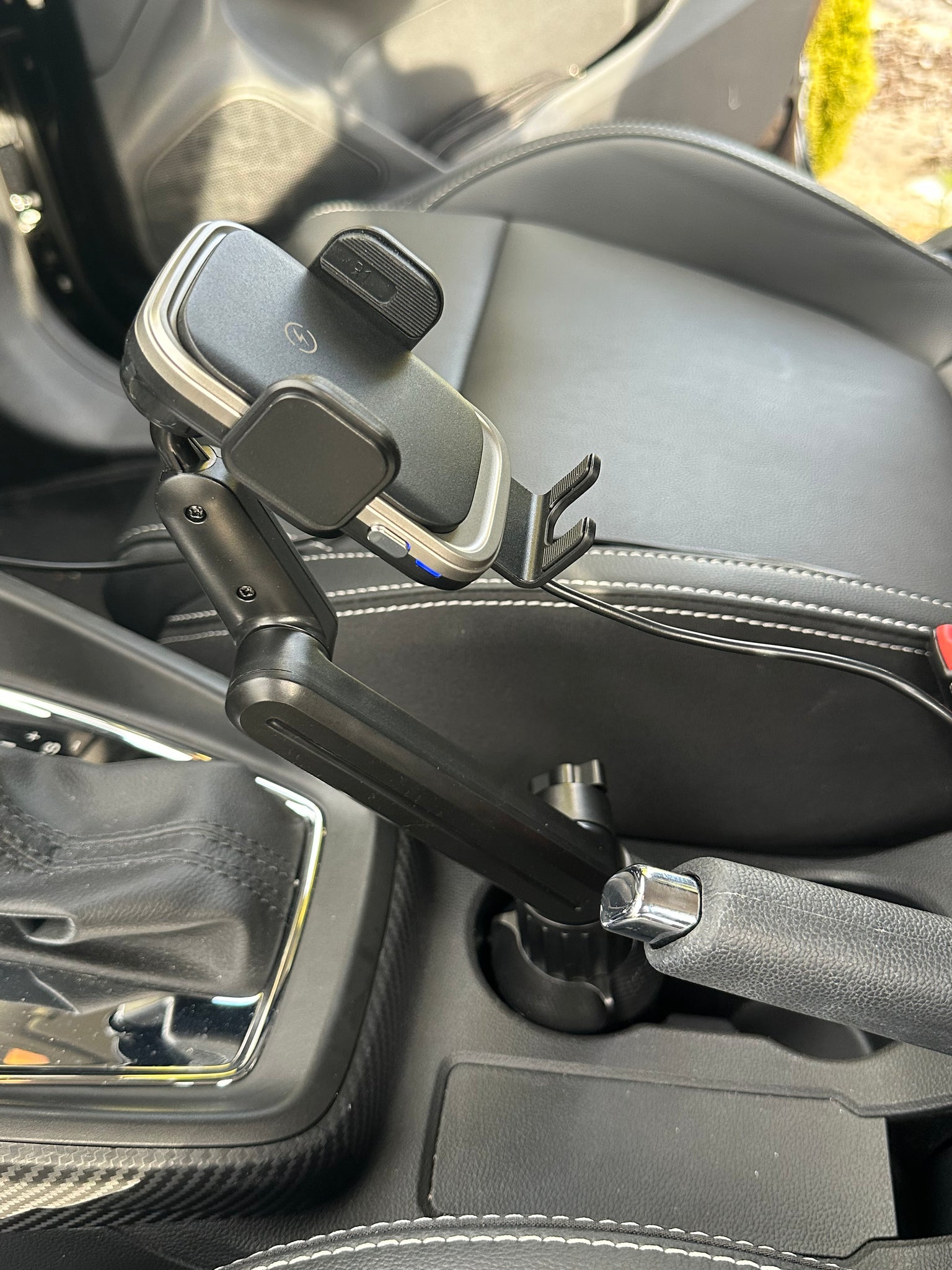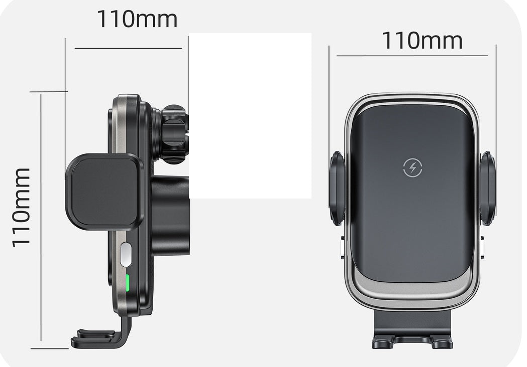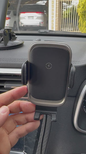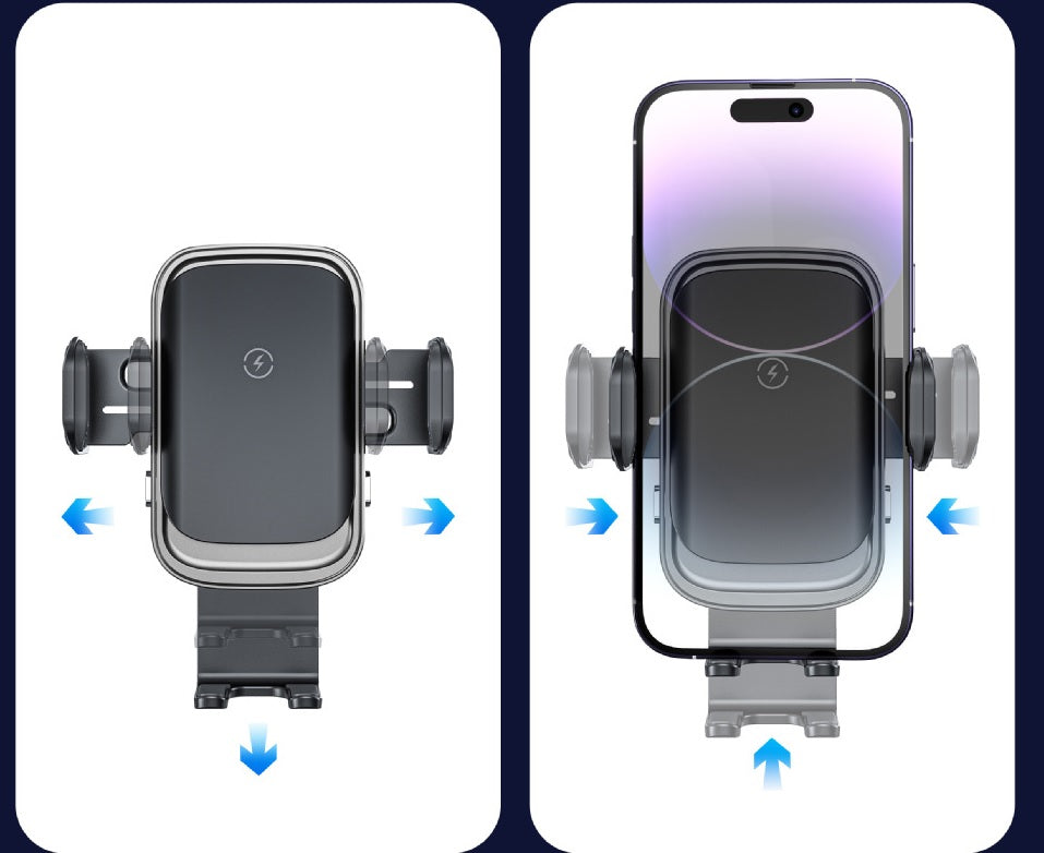 [Smart Sensor Auto Clamping - Hands Free Operation] -- After connecting the cable, put the cell phone into the cordless car charger holder it will Induction by coil induction automatic clamping and start auto charging (supports 4.7-7.5 " cellphones) , touch the two side buttons of the wireless Qi car iphone holder charger can make the arm open. It also support 360 rotation, which is very convenient for driving