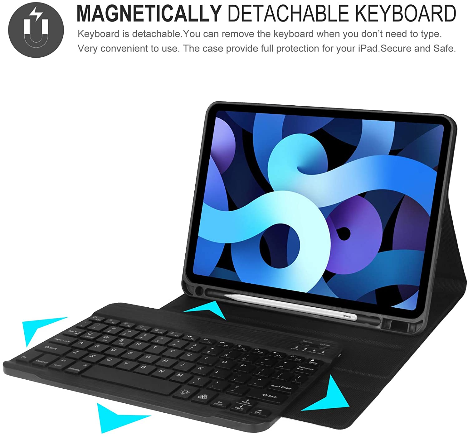 【Detachable & Backlit Bluetooth Keyboard】- 3 levels of brightness and 7 vibrant colors make typing fun and easy in the dark or the light.The ipad 10.9 keyboard can be attached to the case magnetically, if not needed, it can be removed.Bluetooth connectivity is easy.